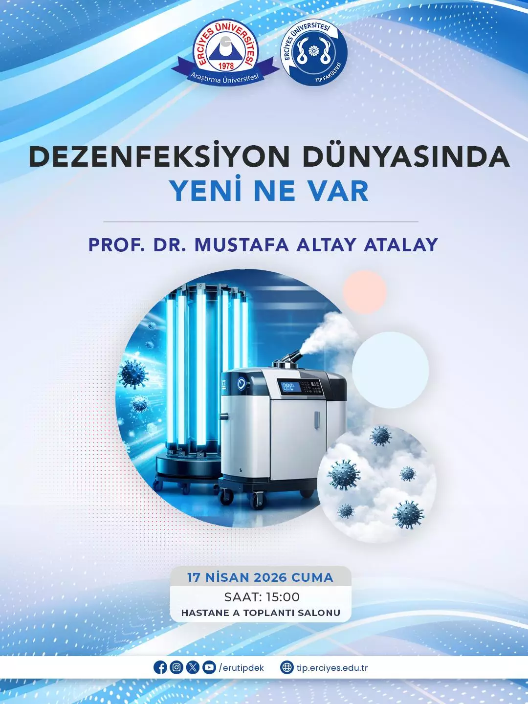 Tıbbi Mikrobiyoloji Anabilim Dalı Öğretim Üyesi Prof. Dr. Mustafa Altay Atalay’ın anlatacağı “Dezenfeksiyon dünyasında yeni ne var” konulu seminerimize tüm öğretim üyelerimiz, araştırma görevlilerimiz ve öğrencilerimiz davetlidir.