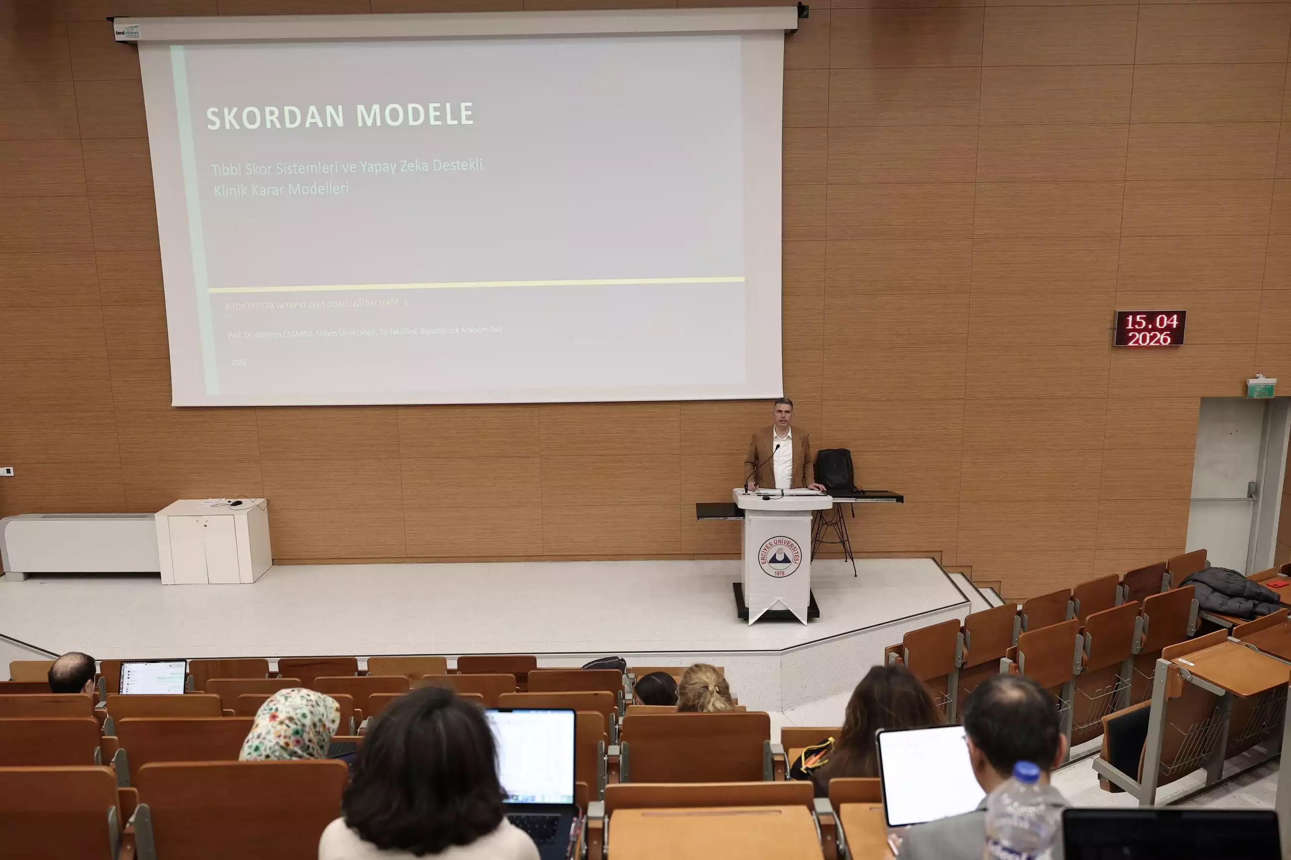 Programda, Prof. Dr. Gökmen Zararsız tarafından “Skordan Modele: Tıbbi Skor Sistemleri ve Yapay Zekâ Destekli Karar Modelleri” başlıklı sunum yapıldı. Eğitimde; klinik skor geliştirme süreçleri, geçerlilik çalışmaları, yapay zekâ ile kestirim modellerinin oluşturulması ve gerçek veriler üzerinden yapılan pratik uygulamalar ele alındı.