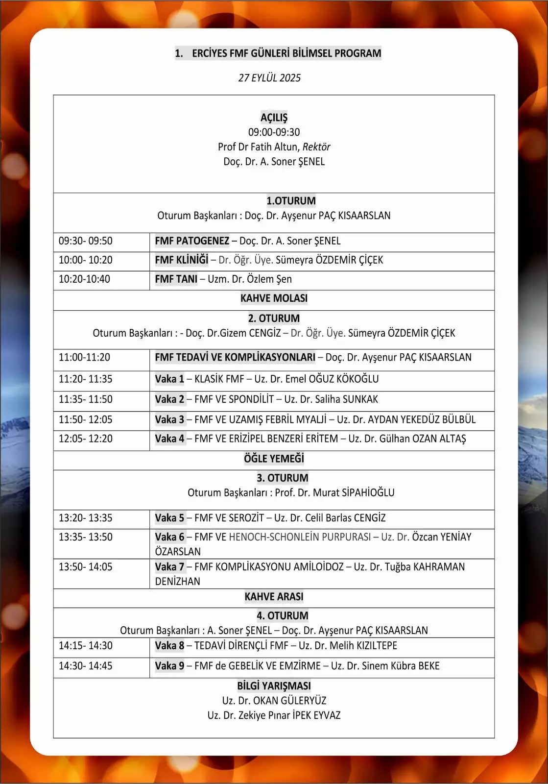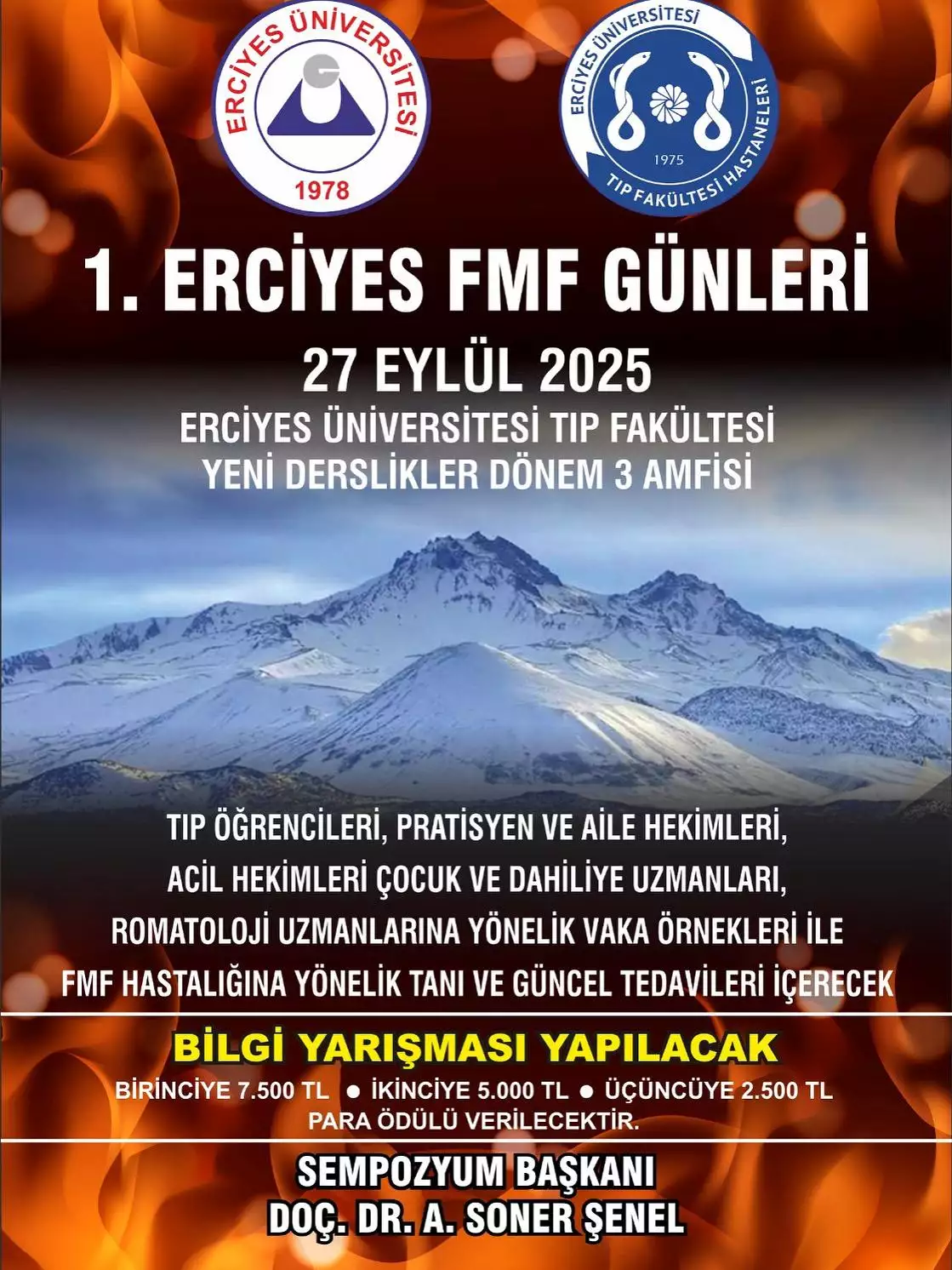 Erciyes Üniversitesi Tıp Fakültesi’nde 27 Eylül 2025 tarihinde 1. Erciyes FMF Günleri gerçekleştirildi. Etkinlikte, FMF hastalığına yönelik tanı yöntemleri ve güncel tedaviler ele alındı. Tıp öğrencileri, pratisyen ve aile hekimleri, acil hekimleri, çocuk sağlığı ve hastalıkları ile dahiliye uzmanları ve romatoloji uzmanlarının katılımıyla vaka örnekleri üzerinden interaktif oturumlar yapıldı.