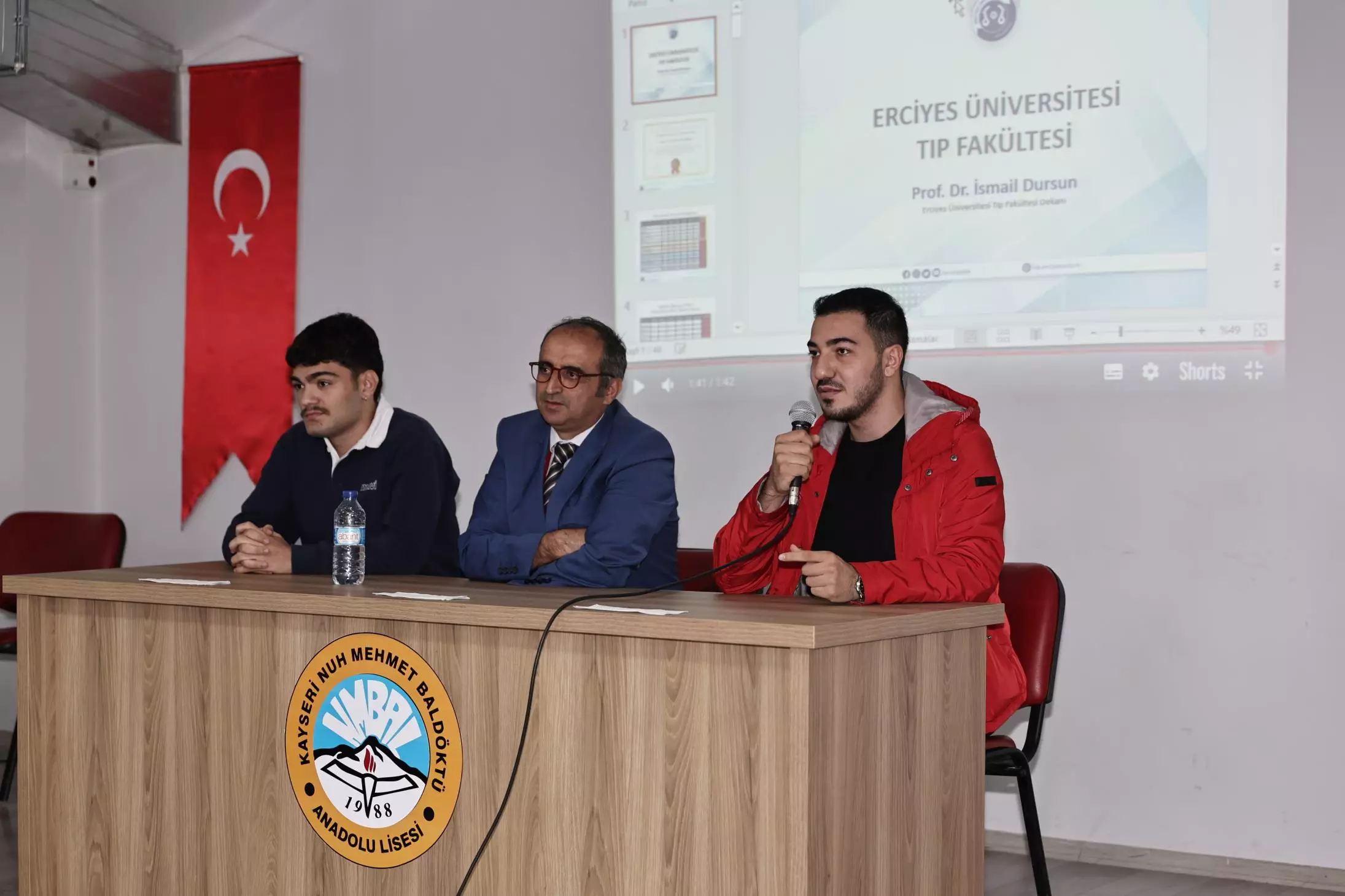 Tıp Fakültemiz Dekanı Prof. Dr. İsmail Dursun, Nuh Mehmet Baldöktü Anadolu Lisesi öğrencileriyle bir araya gelerek fakültemizin eğitim süreçleri, akademik olanakları ve sosyal faaliyetleri hakkında bilgilendirmelerde bulundu. Öğrencilerin merak ettikleri soruları yanıtlayarak tıp eğitimi hakkında kapsamlı bilgiler verdi.
